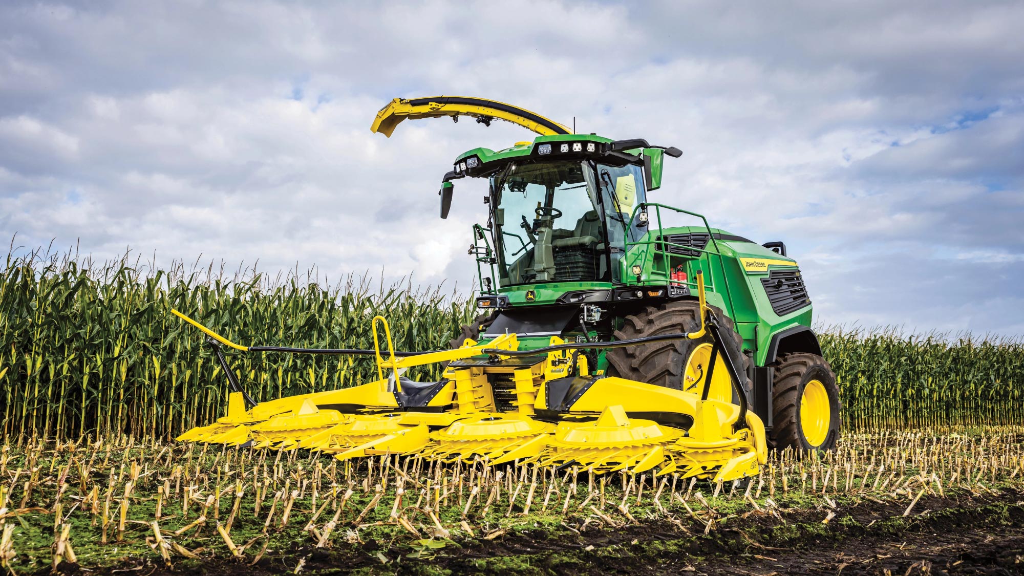 Due to the intelligent design, John Deere self-propelled forage harvesters (SPFH) can be equipped with the largest tires in the industry. Large tires with a diameter up to 2.15 m (7 ft) make it possible to achieve ground clearance of up to 50 cm (19.7 in.) on the John Deere SPFH with a high footprint.
